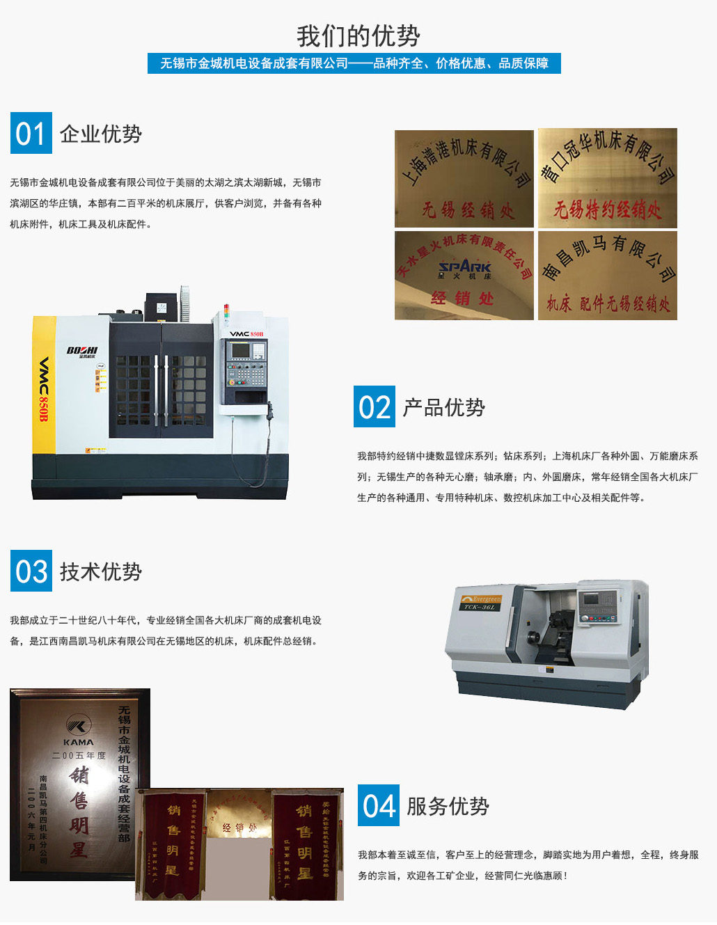 無錫市金城機電設(shè)備成套有限公司位于美麗的太湖之濱太湖新城,無錫市濱湖區(qū)的華莊鎮(zhèn),本部有二百平米的機床展廳,供客戶瀏覽,并備有各種機床附件,機床工具及機床配件。 我部成立于二十世紀八十年代,專業(yè)經(jīng)銷全國各大機床廠商的成套機電設(shè)備,是江西南昌凱馬機床有限公司在無錫地區(qū)的機床,機床配件總經(jīng)銷。系蘭州里海機床有限公司,天水星火...